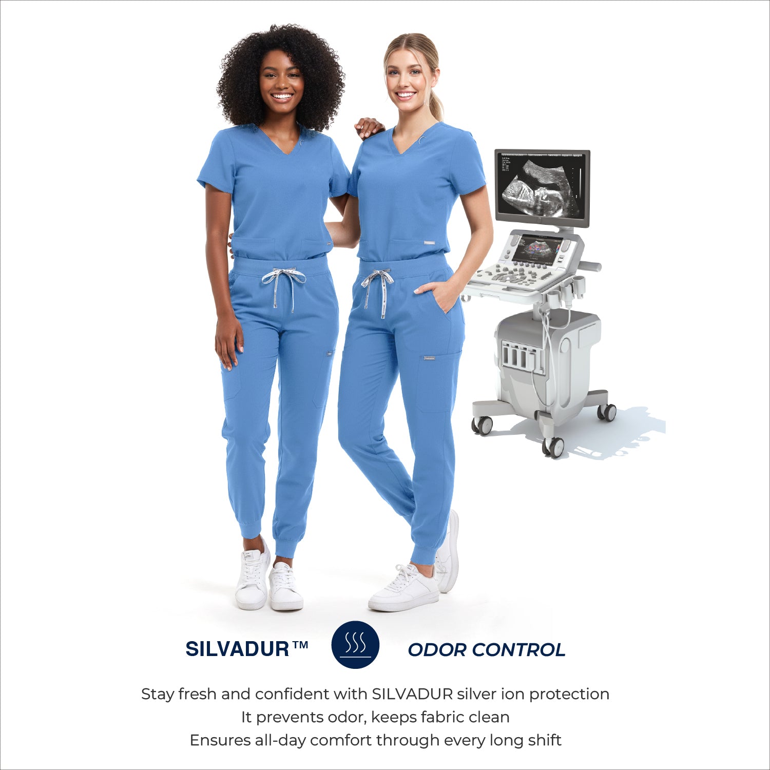 • Powered by Silvadur™ antimicrobial technology to provide odor protection, inhibit bacterial and microbial growth, prevent fabric damage, and extend garment lifespan